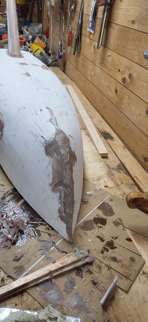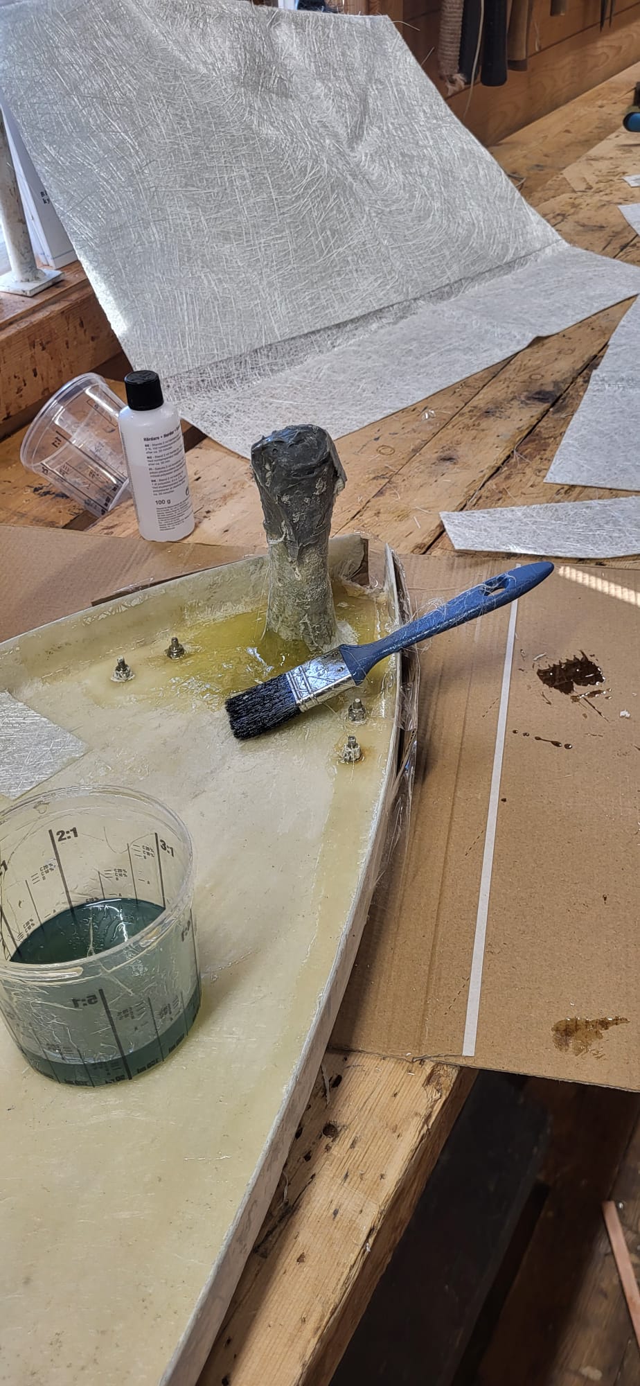 This crew is pretty small. Mrs. Swanson described it as a crew that would work with smelly materials and paint. Maybe that is why fewer people signed up for it. We could see that the crew started by using a scale to measure the weight of the keel and they have been working outside to fill the keel with sand and resin. They definitely had to work with smelly, goopy liquid! The crew measured and mixed the sand and resin that they put into the keel. The keel was filled to the top and the crew started to paint the keel with the paint that keeps the barnacles from attaching to the boat. They are going to start painting the bottom of the boat next week.