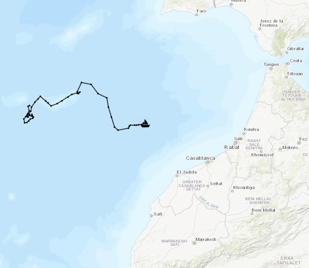 Cyclone has continued to report its location off and on since June. She has traveled Southeast to her current location off the coast of Morocco and near the Canary Islands.