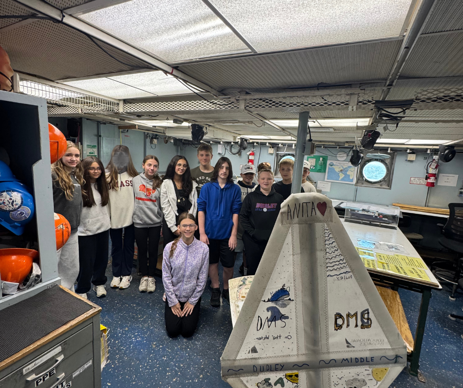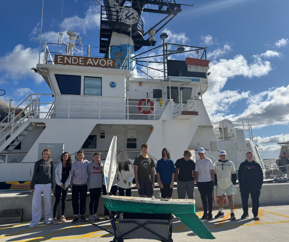 Stacy and a select group of DMS eighth grade students were invited to tour the R/V Endeavor and reunite with their miniboat on University of Rhode Island’s (URI) Narragansett Bay Campus.