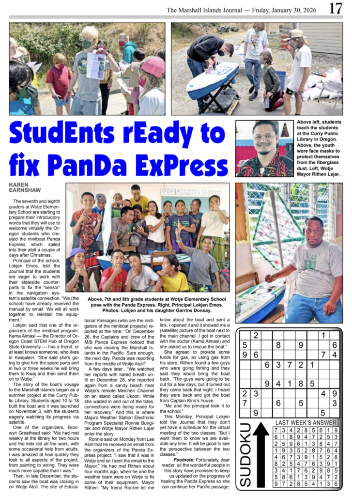 After being recovered from Ukoon, Panda Express has now been transported to a Wotje Public Elementary School where students there will be connected with those who built her in Gold Beach, Oregon (U.S) soon.