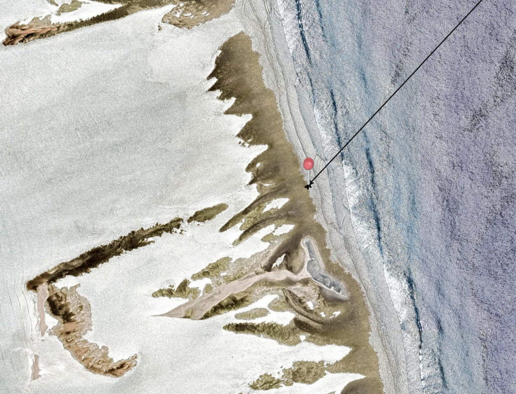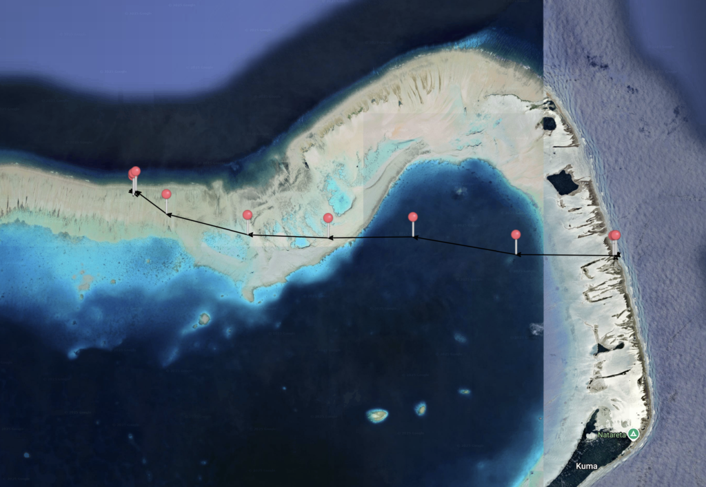 As if she just needed a short rest, M/B Sloughinator started traveling across the atoll after a pit stop of just 6 hours! Presumably during a high tide, she was able to bypass the coral reef and continued to travel to the northern part of the island where she found another sandy beach.