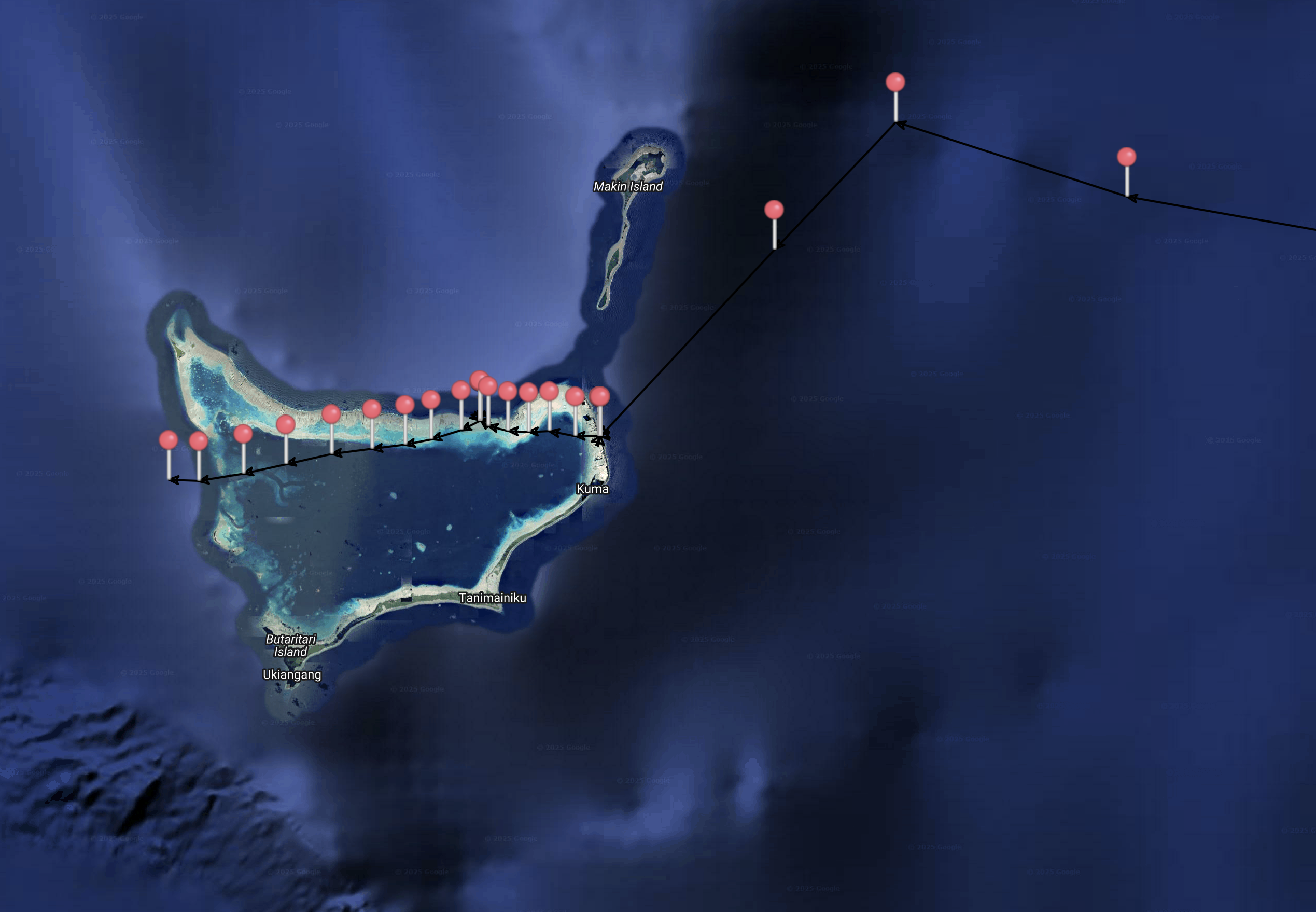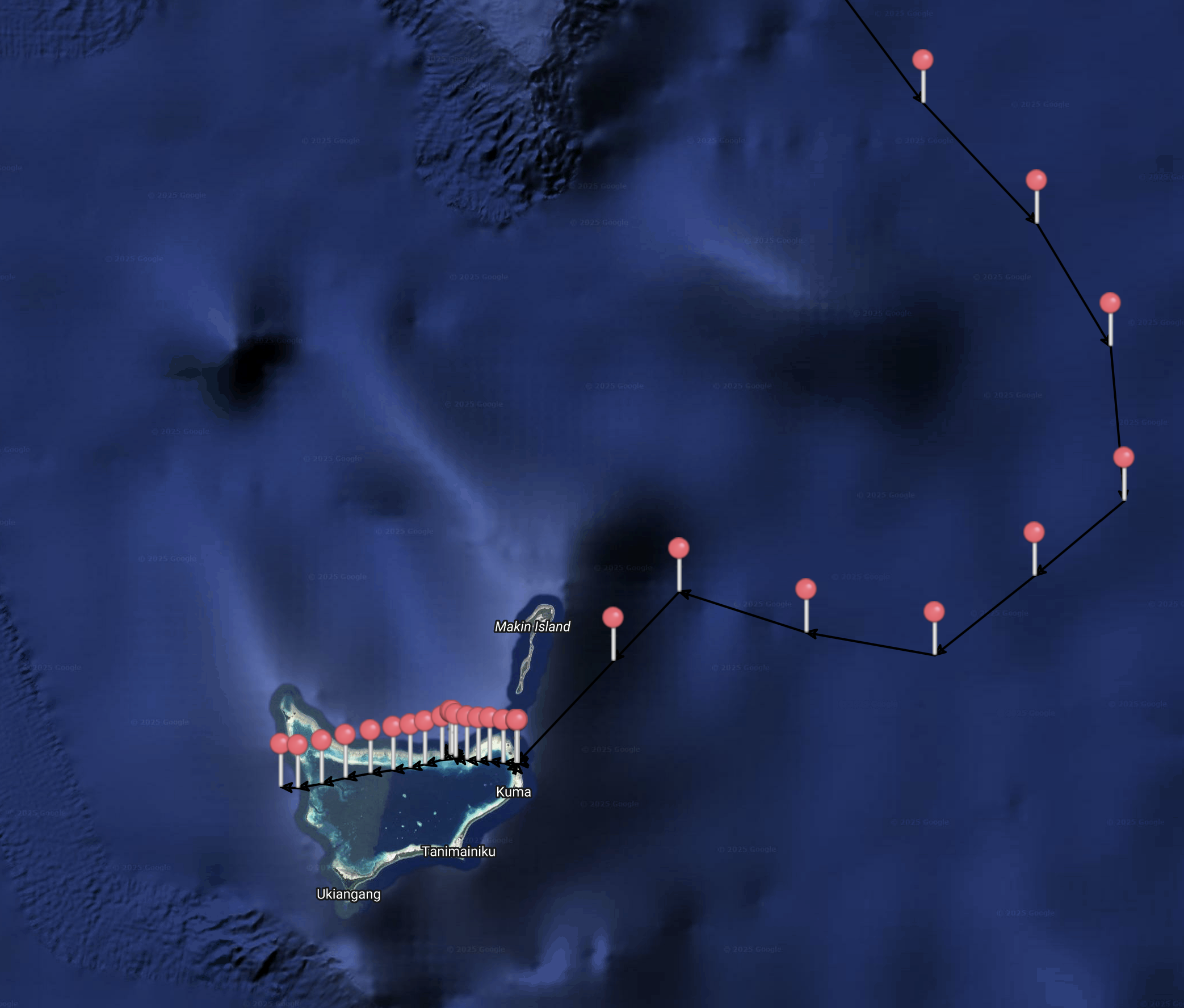 As if she just needed a short rest, M/B Sloughinator started traveling across the atoll after a pit stop of just 6 hours! Presumably during a high tide, she was able to bypass the coral reef and continued to travel to the northern part of the island where she found another sandy beach.