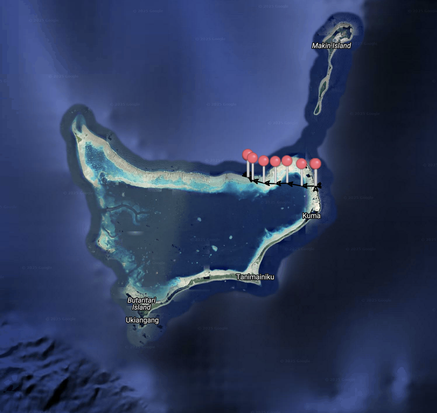 M/B Sloughinator has landed after traveling out at see for 127 days! She found her way to a nice sandy beach in Kiribati’s Butaritari Atoll, just north of Kuma village. We are already working with contacts who helped to recover M/B Nishi Kazi in the past and are hopeful for her rescue.