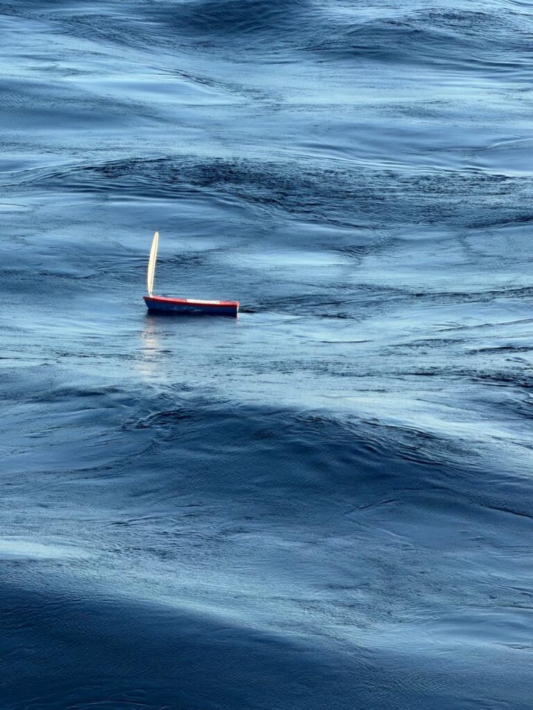With calm waters, waves around 1 meter in height moving west, winds strong at 12.8 knots moving WSW, both miniboats left the “not-so miniboat” quickly excited to get under way on their journey.