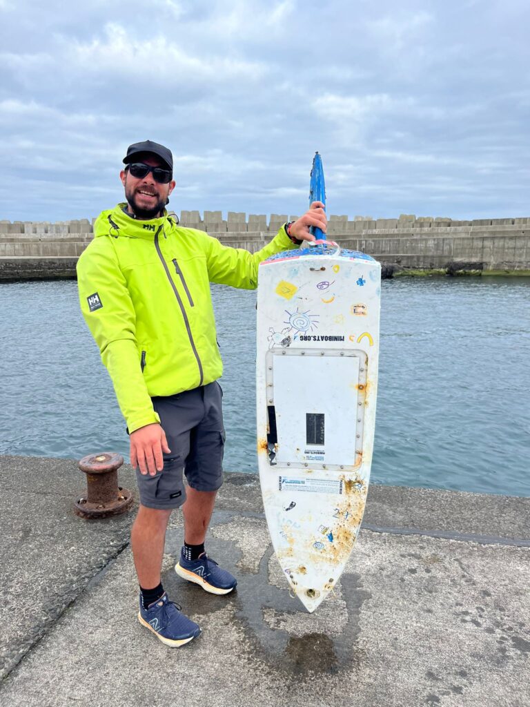The Wildcat Wave approached the Azores in May of 2023, and almost landed on Flores Island. It ended up circling around for another two months and back to the same spot! This time it was picked up by Rogerio Silva. We got an email from Rogerio that said: “I want to inform you that I have found one of your boats with the sail broken 1.5 miles east of flores island on the 8 July, together please find enclosed the pictures of the boat and what was in it.”
